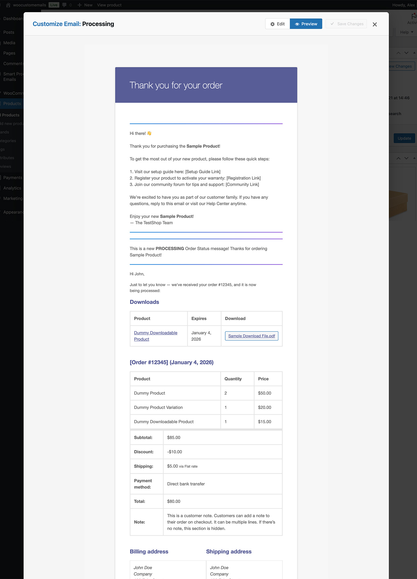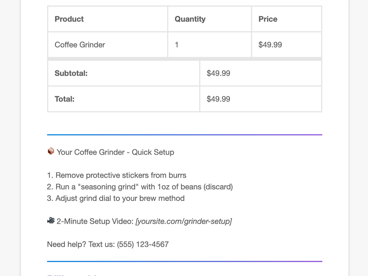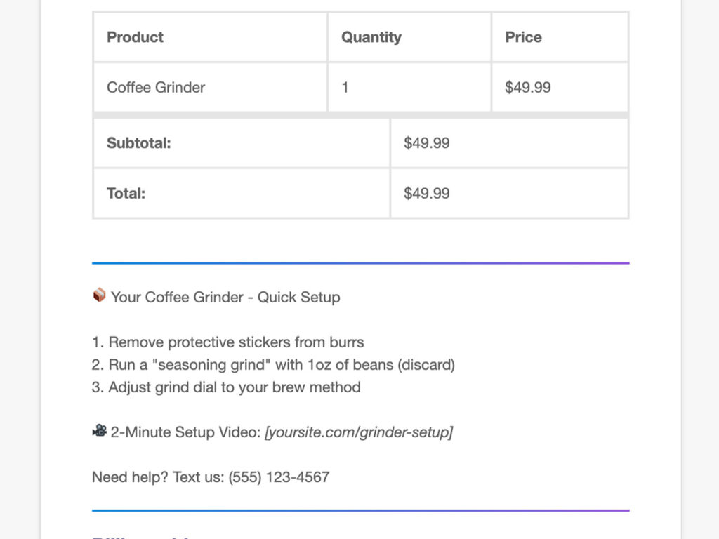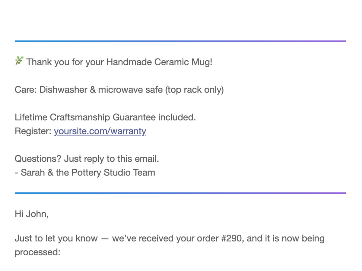 If multiple purchased products share the same message, it displays once. Your customers get clean, professional emails every time.