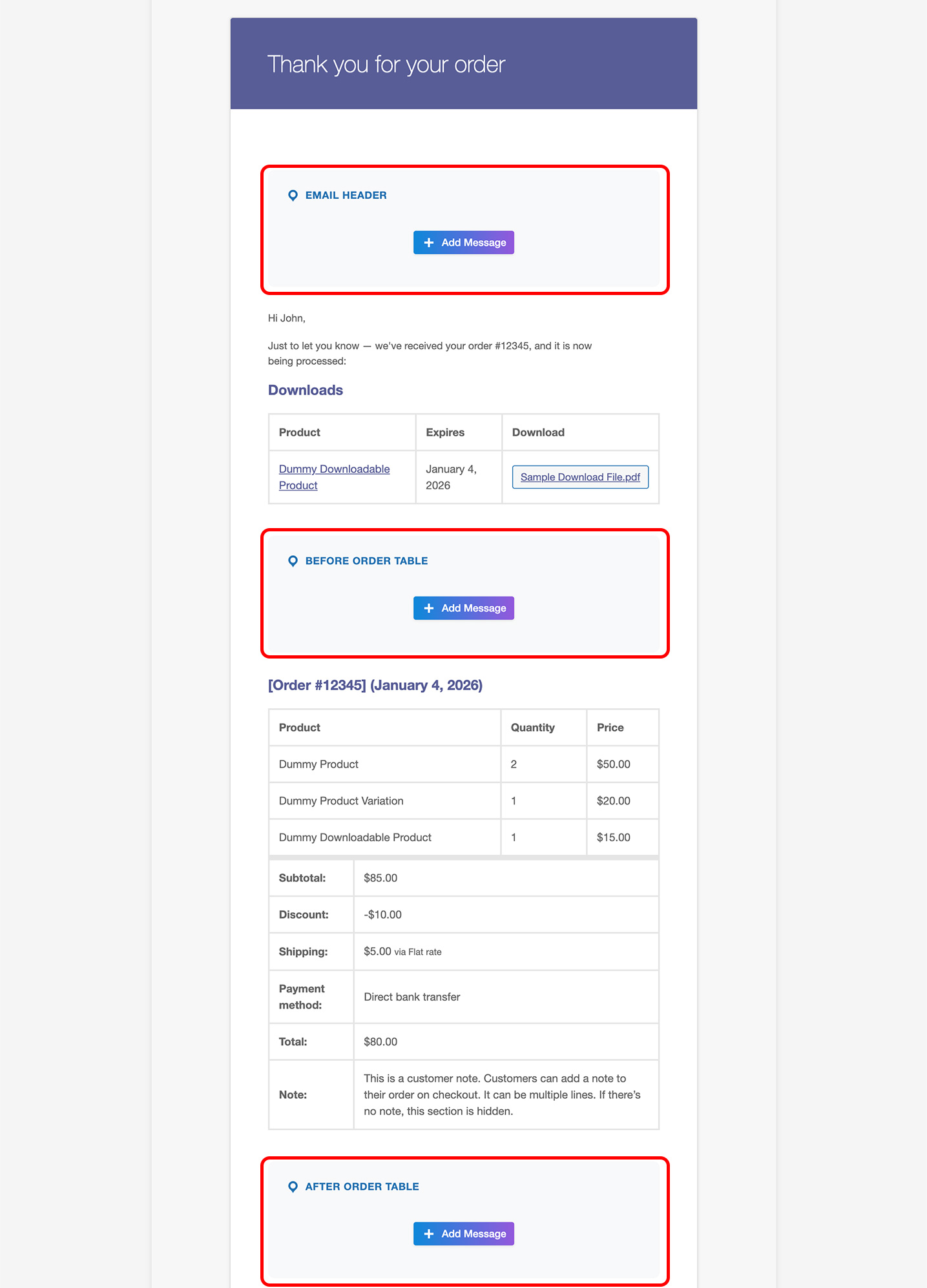 Position your content strategically within WooCommerce’s email template. Choose where messages appear for maximum visibility and impact.